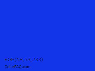 RGB 18,53,233 Color is a normal blue color and the nearest color is Palatinate Blue #273be2. Hex code #1235e9 and RGB value is rgb(18,53,233). In RGB color space, this color is composed of 7% red, 21% green, 91% blue, In CMYK color space, this color is composed of 92% cyan, 77% magenta, 0% yellow , 9% black , In HSL color space, this color has a hue angle of 230° , 86% saturation and 49% lightness.