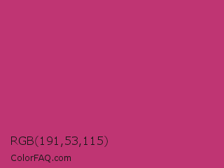 RGB 191,53,115 Color is a normal rose color and the nearest color is Hibiscus #b6316c. Hex code #bf3573 and RGB value is rgb(191,53,115). In RGB color space, this color is composed of 75% red, 21% green, 45% blue, In CMYK color space, this color is composed of 0% cyan, 72% magenta, 40% yellow , 25% black , In HSL color space, this color has a hue angle of 333° , 57% saturation and 48% lightness.