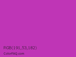 RGB 191,53,182 Color is a normal magenta color and the nearest color is Byzantine #bd33a4. Hex code #bf35b6 and RGB value is rgb(191,53,182). In RGB color space, this color is composed of 75% red, 21% green, 71% blue, In CMYK color space, this color is composed of 0% cyan, 72% magenta, 5% yellow , 25% black , In HSL color space, this color has a hue angle of 304° , 57% saturation and 48% lightness.