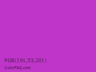 RGB 191,53,201 Color is a normal magenta color and the nearest color is Steel Pink #cc33cc. Hex code #bf35c9 and RGB value is rgb(191,53,201). In RGB color space, this color is composed of 75% red, 21% green, 79% blue, In CMYK color space, this color is composed of 5% cyan, 74% magenta, 0% yellow , 21% black , In HSL color space, this color has a hue angle of 296° , 58% saturation and 50% lightness.