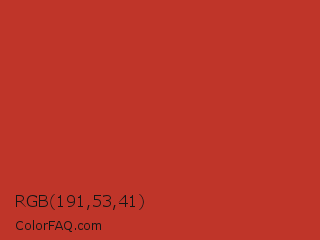 RGB 191,53,41 Color is a normal red color and the nearest color is International Orange Golden Gate Bridge #c0362c. Hex code #bf3529 and RGB value is rgb(191,53,41). In RGB color space, this color is composed of 75% red, 21% green, 16% blue, In CMYK color space, this color is composed of 0% cyan, 72% magenta, 79% yellow , 25% black , In HSL color space, this color has a hue angle of 5° , 65% saturation and 45% lightness.