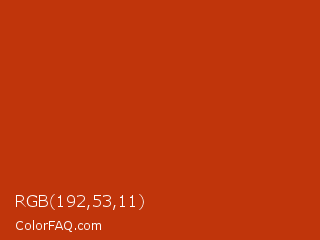 RGB 192,53,11 Color is a normal red color and the nearest color is Rust #b7410e. Hex code #c0350b and RGB value is rgb(192,53,11). In RGB color space, this color is composed of 75% red, 21% green, 4% blue, In CMYK color space, this color is composed of 0% cyan, 72% magenta, 94% yellow , 25% black , In HSL color space, this color has a hue angle of 14° , 89% saturation and 40% lightness.