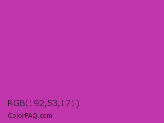 RGB 192,53,171 Color is a normal magenta color and the nearest color is Byzantine #bd33a4. Hex code #c035ab and RGB value is rgb(192,53,171). In RGB color space, this color is composed of 75% red, 21% green, 67% blue, In CMYK color space, this color is composed of 0% cyan, 72% magenta, 11% yellow , 25% black , In HSL color space, this color has a hue angle of 309° , 57% saturation and 48% lightness.