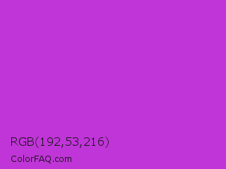 RGB 192,53,216 Color is a normal purple color and the nearest color is Steel Pink #cc33cc. Hex code #c035d8 and RGB value is rgb(192,53,216). In RGB color space, this color is composed of 75% red, 21% green, 85% blue, In CMYK color space, this color is composed of 11% cyan, 75% magenta, 0% yellow , 15% black , In HSL color space, this color has a hue angle of 291° , 68% saturation and 53% lightness.