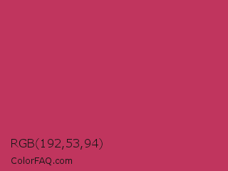 RGB 192,53,94 Color is a normal rose color and the nearest color is Dingy Dungeon #c53151. Hex code #c0355e and RGB value is rgb(192,53,94). In RGB color space, this color is composed of 75% red, 21% green, 37% blue, In CMYK color space, this color is composed of 0% cyan, 72% magenta, 51% yellow , 25% black , In HSL color space, this color has a hue angle of 342° , 57% saturation and 48% lightness.