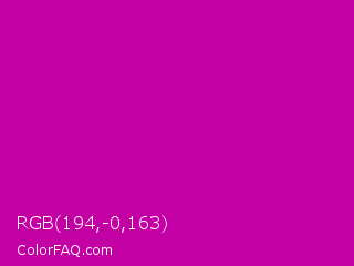 RGB 194,-0,163 Color is a normal magenta color and the nearest color is Heliotrope Magenta #aa00bb. Hex code #c200a3 and RGB value is rgb(194,-0,163). In RGB color space, this color is composed of 76% red, 0% green, 64% blue, In CMYK color space, this color is composed of 0% cyan, 100% magenta, 16% yellow , 24% black , In HSL color space, this color has a hue angle of 310° , 100% saturation and 38% lightness.
