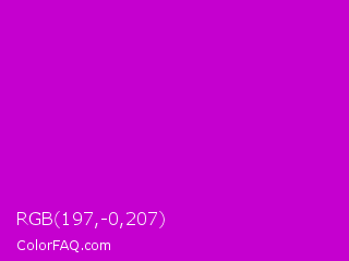 RGB 197,-0,207 Color is a normal magenta color and the nearest color is Deep Magenta #cc00cc. Hex code #c500cf and RGB value is rgb(197,-0,207). In RGB color space, this color is composed of 77% red, 0% green, 81% blue, In CMYK color space, this color is composed of 5% cyan, 100% magenta, 0% yellow , 19% black , In HSL color space, this color has a hue angle of 297° , 100% saturation and 41% lightness.