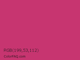 RGB 199,53,112 Color is a normal rose color and the nearest color is Telemagenta #cf3476. Hex code #c73570 and RGB value is rgb(199,53,112). In RGB color space, this color is composed of 78% red, 21% green, 44% blue, In CMYK color space, this color is composed of 0% cyan, 73% magenta, 44% yellow , 22% black , In HSL color space, this color has a hue angle of 336° , 58% saturation and 49% lightness.