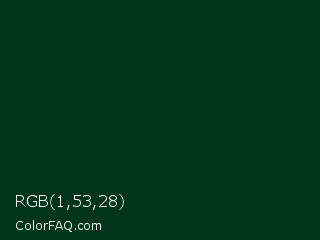 RGB 1,53,28 Color is a very dark green color and the nearest color is Cardin Green #01361c. Hex code #01351c and RGB value is rgb(1,53,28). In RGB color space, this color is composed of 0% red, 21% green, 11% blue, In CMYK color space, this color is composed of 98% cyan, 0% magenta, 47% yellow , 79% black , In HSL color space, this color has a hue angle of 151° , 96% saturation and 11% lightness.