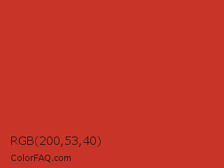 RGB 200,53,40 Color is a normal red color and the nearest color is International Orange Golden Gate Bridge #c0362c. Hex code #c83528 and RGB value is rgb(200,53,40). In RGB color space, this color is composed of 78% red, 21% green, 16% blue, In CMYK color space, this color is composed of 0% cyan, 74% magenta, 80% yellow , 22% black , In HSL color space, this color has a hue angle of 5° , 67% saturation and 47% lightness.