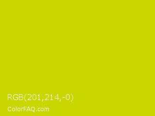 RGB 201,214,-0 Color is a normal yellow color and the nearest color is Bitter Lemon #cae00d. Hex code #c9d600 and RGB value is rgb(201,214,-0). In RGB color space, this color is composed of 79% red, 84% green, 0% blue, In CMYK color space, this color is composed of 6% cyan, 0% magenta, 100% yellow , 16% black , In HSL color space, this color has a hue angle of 64° , 100% saturation and 42% lightness.