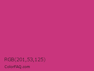 RGB 201,53,125 Color is a normal rose color and the nearest color is Fuchsia Purple #cc397b. Hex code #c9357d and RGB value is rgb(201,53,125). In RGB color space, this color is composed of 79% red, 21% green, 49% blue, In CMYK color space, this color is composed of 0% cyan, 74% magenta, 38% yellow , 21% black , In HSL color space, this color has a hue angle of 331° , 58% saturation and 50% lightness.