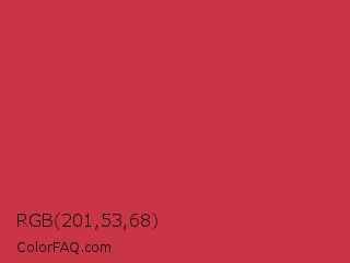 RGB 201,53,68 Color is a normal red color and the nearest color is Brick Red #c62d42. Hex code #c93544 and RGB value is rgb(201,53,68). In RGB color space, this color is composed of 79% red, 21% green, 27% blue, In CMYK color space, this color is composed of 0% cyan, 74% magenta, 66% yellow , 21% black , In HSL color space, this color has a hue angle of 354° , 58% saturation and 50% lightness.
