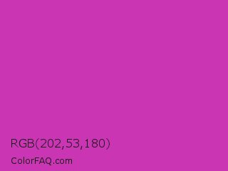 RGB 202,53,180 Color is a normal magenta color and the nearest color is Byzantine #bd33a4. Hex code #ca35b4 and RGB value is rgb(202,53,180). In RGB color space, this color is composed of 79% red, 21% green, 71% blue, In CMYK color space, this color is composed of 0% cyan, 74% magenta, 11% yellow , 21% black , In HSL color space, this color has a hue angle of 309° , 58% saturation and 50% lightness.