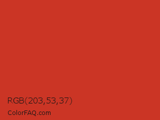 RGB 203,53,37 Color is a normal red color and the nearest color is Dark Pastel Red #c23b22. Hex code #cb3525 and RGB value is rgb(203,53,37). In RGB color space, this color is composed of 80% red, 21% green, 15% blue, In CMYK color space, this color is composed of 0% cyan, 74% magenta, 82% yellow , 20% black , In HSL color space, this color has a hue angle of 6° , 69% saturation and 47% lightness.