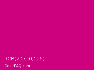 RGB 205,-0,126 Color is a normal magenta color and the nearest color is Red Violet #c71585. Hex code #cd007e and RGB value is rgb(205,-0,126). In RGB color space, this color is composed of 80% red, 0% green, 49% blue, In CMYK color space, this color is composed of 0% cyan, 100% magenta, 39% yellow , 20% black , In HSL color space, this color has a hue angle of 323° , 100% saturation and 40% lightness.