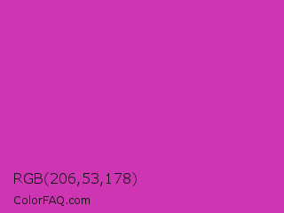 RGB 206,53,178 Color is a normal magenta color and the nearest color is Byzantine #bd33a4. Hex code #ce35b2 and RGB value is rgb(206,53,178). In RGB color space, this color is composed of 81% red, 21% green, 70% blue, In CMYK color space, this color is composed of 0% cyan, 74% magenta, 14% yellow , 19% black , In HSL color space, this color has a hue angle of 311° , 61% saturation and 51% lightness.