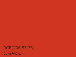 RGB 206,53,33 Color is a normal red color and the nearest color is Vermilion #d9381e. Hex code #ce3521 and RGB value is rgb(206,53,33). In RGB color space, this color is composed of 81% red, 21% green, 13% blue, In CMYK color space, this color is composed of 0% cyan, 74% magenta, 84% yellow , 19% black , In HSL color space, this color has a hue angle of 7° , 72% saturation and 47% lightness.