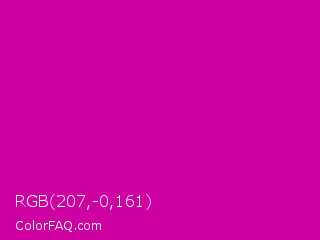 RGB 207,-0,161 Color is a normal magenta color and the nearest color is Red Violet #c71585. Hex code #cf00a1 and RGB value is rgb(207,-0,161). In RGB color space, this color is composed of 81% red, 0% green, 63% blue, In CMYK color space, this color is composed of 0% cyan, 100% magenta, 22% yellow , 19% black , In HSL color space, this color has a hue angle of 313° , 100% saturation and 41% lightness.
