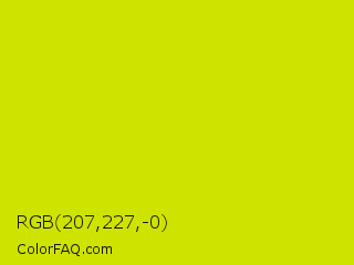 RGB 207,227,-0 Color is a normal yellow color and the nearest color is Bitter Lemon #cae00d. Hex code #cfe300 and RGB value is rgb(207,227,-0). In RGB color space, this color is composed of 81% red, 89% green, 0% blue, In CMYK color space, this color is composed of 9% cyan, 0% magenta, 100% yellow , 11% black , In HSL color space, this color has a hue angle of 65° , 100% saturation and 45% lightness.