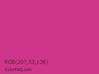 RGB 207,53,138 Color is a normal magenta color and the nearest color is Magenta Pink #cc338b. Hex code #cf358a and RGB value is rgb(207,53,138). In RGB color space, this color is composed of 81% red, 21% green, 54% blue, In CMYK color space, this color is composed of 0% cyan, 74% magenta, 33% yellow , 19% black , In HSL color space, this color has a hue angle of 327° , 62% saturation and 51% lightness.