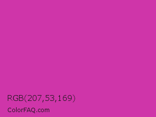 RGB 207,53,169 Color is a normal magenta color and the nearest color is Byzantine #bd33a4. Hex code #cf35a9 and RGB value is rgb(207,53,169). In RGB color space, this color is composed of 81% red, 21% green, 66% blue, In CMYK color space, this color is composed of 0% cyan, 74% magenta, 18% yellow , 19% black , In HSL color space, this color has a hue angle of 315° , 62% saturation and 51% lightness.