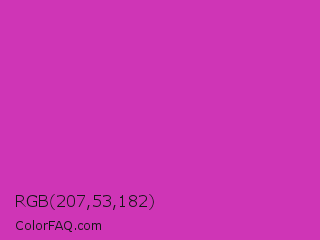 RGB 207,53,182 Color is a normal magenta color and the nearest color is Steel Pink #cc33cc. Hex code #cf35b6 and RGB value is rgb(207,53,182). In RGB color space, this color is composed of 81% red, 21% green, 71% blue, In CMYK color space, this color is composed of 0% cyan, 74% magenta, 12% yellow , 19% black , In HSL color space, this color has a hue angle of 310° , 62% saturation and 51% lightness.