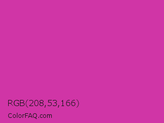 RGB 208,53,166 Color is a normal magenta color and the nearest color is Byzantine #bd33a4. Hex code #d035a6 and RGB value is rgb(208,53,166). In RGB color space, this color is composed of 82% red, 21% green, 65% blue, In CMYK color space, this color is composed of 0% cyan, 75% magenta, 20% yellow , 18% black , In HSL color space, this color has a hue angle of 316° , 62% saturation and 51% lightness.