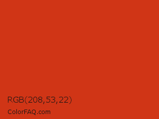 RGB 208,53,22 Color is a normal red color and the nearest color is Vermilion #d9381e. Hex code #d03516 and RGB value is rgb(208,53,22). In RGB color space, this color is composed of 82% red, 21% green, 9% blue, In CMYK color space, this color is composed of 0% cyan, 75% magenta, 89% yellow , 18% black , In HSL color space, this color has a hue angle of 10° , 81% saturation and 45% lightness.