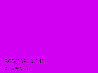 RGB 209,-0,242 Color is a normal magenta color and the nearest color is Vivid Orchid #cc00ff. Hex code #d100f2 and RGB value is rgb(209,-0,242). In RGB color space, this color is composed of 82% red, 0% green, 95% blue, In CMYK color space, this color is composed of 14% cyan, 100% magenta, 0% yellow , 5% black , In HSL color space, this color has a hue angle of 292° , 100% saturation and 47% lightness.