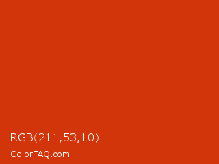 RGB 211,53,10 Color is a normal red color and the nearest color is Sinopia #cb410b. Hex code #d3350a and RGB value is rgb(211,53,10). In RGB color space, this color is composed of 83% red, 21% green, 4% blue, In CMYK color space, this color is composed of 0% cyan, 75% magenta, 95% yellow , 17% black , In HSL color space, this color has a hue angle of 13° , 91% saturation and 43% lightness.