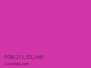 RGB 211,53,168 Color is a normal magenta color and the nearest color is Frostbite #e936a7. Hex code #d335a8 and RGB value is rgb(211,53,168). In RGB color space, this color is composed of 83% red, 21% green, 66% blue, In CMYK color space, this color is composed of 0% cyan, 75% magenta, 20% yellow , 17% black , In HSL color space, this color has a hue angle of 316° , 64% saturation and 52% lightness.