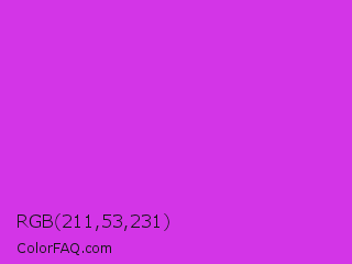 RGB 211,53,231 Color is a normal magenta color and the nearest color is Steel Pink #cc33cc. Hex code #d335e7 and RGB value is rgb(211,53,231). In RGB color space, this color is composed of 83% red, 21% green, 91% blue, In CMYK color space, this color is composed of 9% cyan, 77% magenta, 0% yellow , 9% black , In HSL color space, this color has a hue angle of 293° , 79% saturation and 56% lightness.