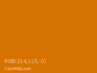RGB 214,115,-0 Color is a normal orange color and the nearest color is Bamboo #da6304. Hex code #d67300 and RGB value is rgb(214,115,-0). In RGB color space, this color is composed of 84% red, 45% green, 0% blue, In CMYK color space, this color is composed of 0% cyan, 46% magenta, 100% yellow , 16% black , In HSL color space, this color has a hue angle of 32° , 100% saturation and 42% lightness.