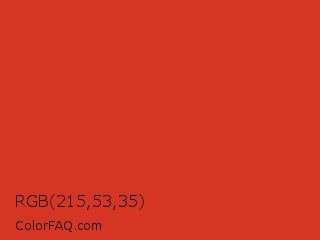RGB 215,53,35 Color is a normal red color and the nearest color is Vermilion #d9381e. Hex code #d73523 and RGB value is rgb(215,53,35). In RGB color space, this color is composed of 84% red, 21% green, 14% blue, In CMYK color space, this color is composed of 0% cyan, 75% magenta, 84% yellow , 16% black , In HSL color space, this color has a hue angle of 6° , 72% saturation and 49% lightness.