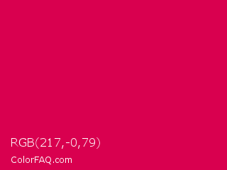 RGB 217,-0,79 Color is a normal rose color and the nearest color is UA Red #d9004c. Hex code #d9004f and RGB value is rgb(217,-0,79). In RGB color space, this color is composed of 85% red, 0% green, 31% blue, In CMYK color space, this color is composed of 0% cyan, 100% magenta, 64% yellow , 15% black , In HSL color space, this color has a hue angle of 338° , 100% saturation and 43% lightness.