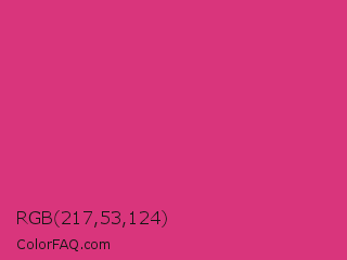 RGB 217,53,124 Color is a normal rose color and the nearest color is Cerise #da3287. Hex code #d9357c and RGB value is rgb(217,53,124). In RGB color space, this color is composed of 85% red, 21% green, 49% blue, In CMYK color space, this color is composed of 0% cyan, 76% magenta, 43% yellow , 15% black , In HSL color space, this color has a hue angle of 334° , 68% saturation and 53% lightness.