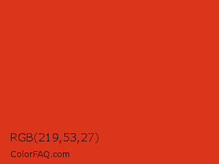RGB 219,53,27 Color is a normal red color and the nearest color is Vermilion #d9381e. Hex code #db351b and RGB value is rgb(219,53,27). In RGB color space, this color is composed of 86% red, 21% green, 11% blue, In CMYK color space, this color is composed of 0% cyan, 76% magenta, 88% yellow , 14% black , In HSL color space, this color has a hue angle of 8° , 78% saturation and 48% lightness.