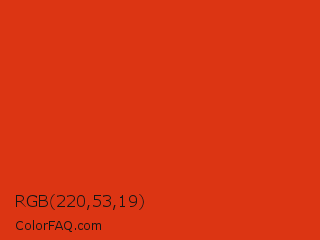 RGB 220,53,19 Color is a normal red color and the nearest color is Vermilion #d9381e. Hex code #dc3513 and RGB value is rgb(220,53,19). In RGB color space, this color is composed of 86% red, 21% green, 7% blue, In CMYK color space, this color is composed of 0% cyan, 76% magenta, 91% yellow , 14% black , In HSL color space, this color has a hue angle of 10° , 84% saturation and 47% lightness.