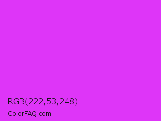 RGB 222,53,248 Color is a normal magenta color and the nearest color is Steel Pink #cc33cc. Hex code #de35f8 and RGB value is rgb(222,53,248). In RGB color space, this color is composed of 87% red, 21% green, 97% blue, In CMYK color space, this color is composed of 10% cyan, 79% magenta, 0% yellow , 3% black , In HSL color space, this color has a hue angle of 292° , 93% saturation and 59% lightness.