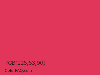 RGB 225,53,90 Color is a normal red color and the nearest color is Cerise Red #de3163. Hex code #e1355a and RGB value is rgb(225,53,90). In RGB color space, this color is composed of 88% red, 21% green, 35% blue, In CMYK color space, this color is composed of 0% cyan, 76% magenta, 60% yellow , 12% black , In HSL color space, this color has a hue angle of 347° , 74% saturation and 55% lightness.