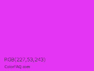 RGB 227,53,243 Color is a normal magenta color and the nearest color is Purple Pizzazz #fe4eda. Hex code #e335f3 and RGB value is rgb(227,53,243). In RGB color space, this color is composed of 89% red, 21% green, 95% blue, In CMYK color space, this color is composed of 7% cyan, 78% magenta, 0% yellow , 5% black , In HSL color space, this color has a hue angle of 295° , 89% saturation and 58% lightness.
