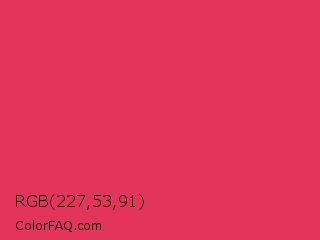 RGB 227,53,91 Color is a normal red color and the nearest color is Cerise Red #de3163. Hex code #e3355b and RGB value is rgb(227,53,91). In RGB color space, this color is composed of 89% red, 21% green, 36% blue, In CMYK color space, this color is composed of 0% cyan, 77% magenta, 60% yellow , 11% black , In HSL color space, this color has a hue angle of 347° , 76% saturation and 55% lightness.