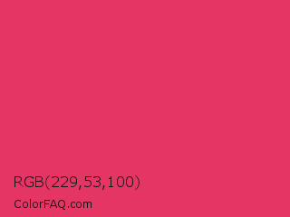 RGB 229,53,100 Color is a normal rose color and the nearest color is Cerise Red #de3163. Hex code #e53564 and RGB value is rgb(229,53,100). In RGB color space, this color is composed of 90% red, 21% green, 39% blue, In CMYK color space, this color is composed of 0% cyan, 77% magenta, 56% yellow , 10% black , In HSL color space, this color has a hue angle of 344° , 77% saturation and 55% lightness.