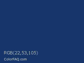 RGB 22,53,105 Color is a dark blue color and the nearest color is Biscay #1b3162. Hex code #163569 and RGB value is rgb(22,53,105). In RGB color space, this color is composed of 9% red, 21% green, 41% blue, In CMYK color space, this color is composed of 79% cyan, 50% magenta, 0% yellow , 59% black , In HSL color space, this color has a hue angle of 218° , 65% saturation and 25% lightness.