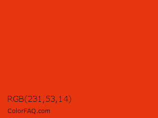 RGB 231,53,14 Color is a normal red color and the nearest color is Vermilion #d9381e. Hex code #e7350e and RGB value is rgb(231,53,14). In RGB color space, this color is composed of 91% red, 21% green, 5% blue, In CMYK color space, this color is composed of 0% cyan, 77% magenta, 94% yellow , 9% black , In HSL color space, this color has a hue angle of 11° , 89% saturation and 48% lightness.