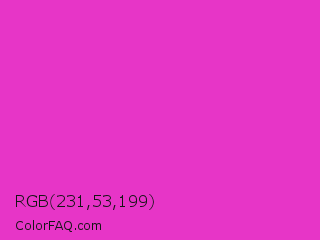 RGB 231,53,199 Color is a normal magenta color and the nearest color is Razzle Dazzle Rose #ff33cc. Hex code #e735c7 and RGB value is rgb(231,53,199). In RGB color space, this color is composed of 91% red, 21% green, 78% blue, In CMYK color space, this color is composed of 0% cyan, 77% magenta, 14% yellow , 9% black , In HSL color space, this color has a hue angle of 311° , 79% saturation and 56% lightness.