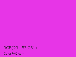 RGB 231,53,231 Color is a normal magenta color and the nearest color is Razzle Dazzle Rose #ff33cc. Hex code #e735e7 and RGB value is rgb(231,53,231). In RGB color space, this color is composed of 91% red, 21% green, 91% blue, In CMYK color space, this color is composed of 0% cyan, 77% magenta, 0% yellow , 9% black , In HSL color space, this color has a hue angle of 300° , 79% saturation and 56% lightness.