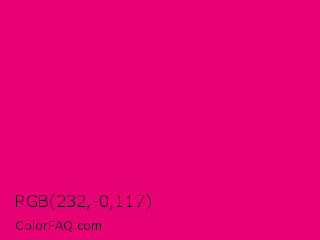 RGB 232,-0,117 Color is a normal rose color and the nearest color is Red Purple #e40078. Hex code #e80075 and RGB value is rgb(232,-0,117). In RGB color space, this color is composed of 91% red, 0% green, 46% blue, In CMYK color space, this color is composed of 0% cyan, 100% magenta, 50% yellow , 9% black , In HSL color space, this color has a hue angle of 330° , 100% saturation and 45% lightness.
