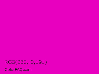 RGB 232,-0,191 Color is a normal magenta color and the nearest color is Shocking Pink #fc0fc0. Hex code #e800bf and RGB value is rgb(232,-0,191). In RGB color space, this color is composed of 91% red, 0% green, 75% blue, In CMYK color space, this color is composed of 0% cyan, 100% magenta, 18% yellow , 9% black , In HSL color space, this color has a hue angle of 311° , 100% saturation and 45% lightness.
